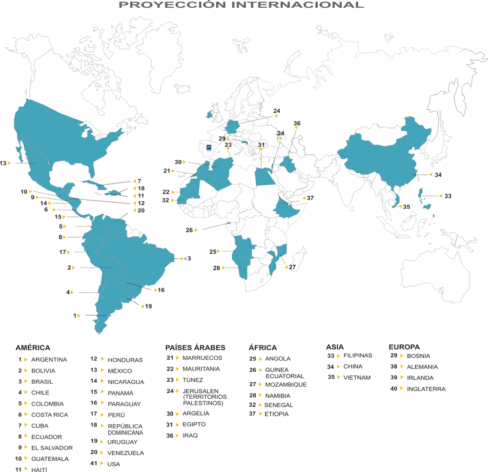 El alcance globalizado de la producción de proyectos informáticos, muy común en nuestro sector de actividad, nos ha permitido mantener una estrecha relación de colaboración internacional con no pocos clientes de los sectores público y privado. DBF ha trabajado en coordinación con la Agencia Española de Cooperación Internacional, embajadas y Oficinas Técnicas de Cooperación del gobierno de España, en el desarrollo e implementación de programas culturales, educacionales y de gestión tales como «Arte Español en el Exterior», «Metodología de Cooperación para el Desarrollo», «Registro y Gestión de ONGD’s», … Esta colaboración nos ha dado la oportunidad de implementar proyectos en áreas geográficas muy diversas. Por cuanto respecta a un nivel europeo, y aún más allá, intercontinental, contamos con la suficiente experiencia capacitadora de relaciones sólidas entre partners, lo cual, nos ha permitido generar y mantener una cartera de importantes de clientes y de socios internacionales en gran variedad de países.